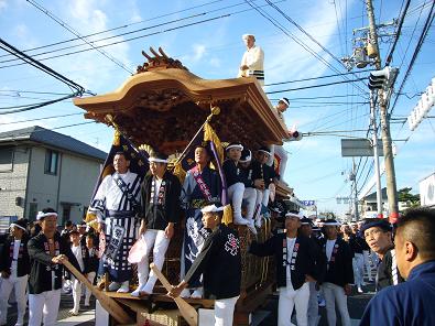 だんじり制作年 昭和61年 制作工務店 池内工務店 主彫刻師 木下賢治 見送り 大坂夏之陣 土呂幕 (正面)秀吉本陣佐久間の乱入 (右面)加藤清正 山路将監の一騎打 (左面)本能寺の変 町名持 役行者 夜疑神社宮入り 2番 駅前パレード 11番 行基参り 11番