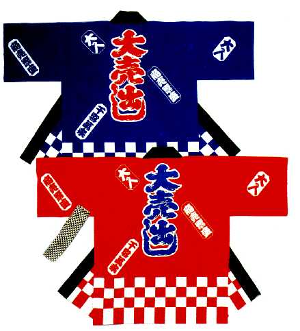 使用生地:天竺 素材:綿100% サイズ:大人フリー (身丈80cm 身巾65cm) 衿:大売出し 染:反応染料染 色:青、赤 ●帯はシーズンにより多少変わる場合があります。 注文枚数に応じて卸売できます。